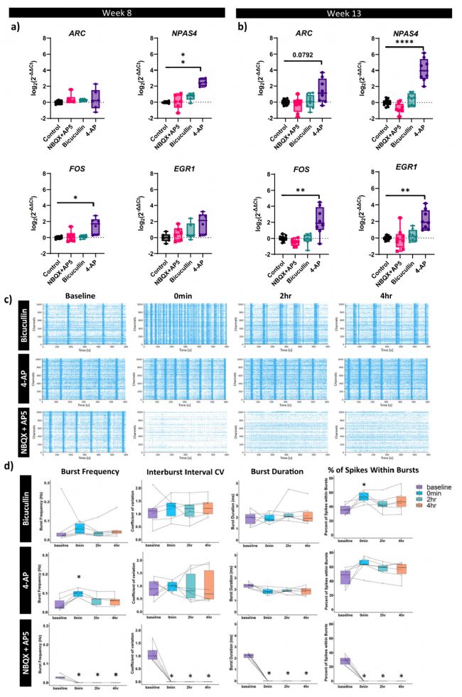 使用GABA能拮抗劑(bicuculline)鉀通道拮抗劑(4-AP)增強網絡活動并誘導IEGs表達,而谷氨酸能受體拮抗劑(NBQX+AP5)則完全抑制爆發活動(Figure 6)。進一步阻斷多巴胺能和去甲腎上腺素能神經元后,剩余活動顯著減少,表明這些神經元在維持基礎活動中起重要作用。