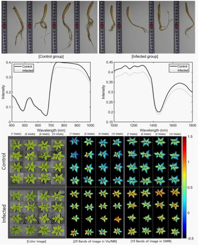 圖1 高光譜反射成像用于無損評(píng)估高麗參根腐病:從上到下為對(duì)照組與根腐病感染組的根發(fā)育對(duì)比圖;兩組在可見-近紅外和短波紅外的平均光譜圖;兩組的彩色圖像和多光譜圖像(Vis/NIR和SWIR區(qū)域中主要波段的差異)