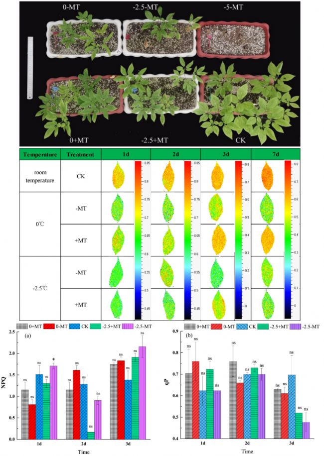 葉綠素?zé)晒獬上窦夹g(shù)為冷凍脅迫下人參損傷評(píng)估、褪黑素緩解效果驗(yàn)證及抗逆機(jī)制研究提供了直觀數(shù)據(jù)依據(jù)。借助葉綠素?zé)晒獬上裣到y(tǒng)監(jiān)測(cè)發(fā)現(xiàn),Fv/Fm 比值(反映 PSⅡ 光化學(xué)效率)在 - 2.5℃冷凍脅迫后顯著降至 0.78 以下,而噴施 100 nmol・L⁻¹ 褪黑素 1 周后,該比值可恢復(fù)至 0.8 以上;NPQ(非光化學(xué)淬滅,反映光保護(hù)能力)在脅迫后未施藥組較對(duì)照組升高 11.44%,施藥組則顯著降低,證明褪黑素可減輕光抑制損傷。說明葉綠素?zé)晒獬上窦夹g(shù)能無損、可視化呈現(xiàn)冷凍脅迫對(duì)人參光合系統(tǒng)的影響及緩解效果,動(dòng)態(tài)追蹤葉片光合功能恢復(fù)過程,為人參抗寒栽培與逆境損傷修復(fù)提供精準(zhǔn)的表型觀測(cè)手段。