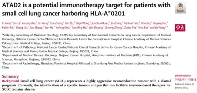 2025年1月13日,中國醫學科學院腫瘤醫院腫瘤內科王潔教授團隊在eBioMedicine(IF=9.7,Q1)上發表了題為“ATAD2 is a potential immunotherapy target for patients with small cell lung cancer harboring HLA-A∗0201”研究成果。該研究通過基于質譜的免疫肽組學技術分析了SCLC細胞系標本中的睪丸抗原(CTA),結合測序的數據發現ATAD2的表達水平在SCLC患者中顯著升高,且與ASCL1的表達呈正相關,進一步篩選出YSDDDVPSV多肽作為一種潛在的腫瘤抗原標志物,能夠激活HLA-A02:01限制的T細胞,為SCLC的免疫治療提供了新的方向。