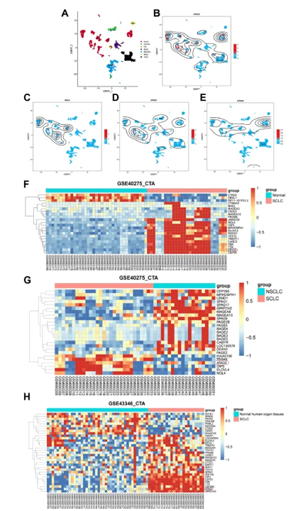 本研究對11個SCLC細胞系提取的HLA-I呈遞多肽進行了LC-MS/MS分析(圖2A),通過PEAKS® DeepNovo Peptidome工作流,與uniprot和swissprot人類序列數據庫進行匹配,結果共檢測到99個CTA,其中有6個是所有細胞系共有的(圖2B):ATAD2、NOL4、POTEE、SPAG1、SPAG8 和 TEX15。此外,scRNA-seq數據顯示,與細胞系模型相比,臨床SCLC實體腫瘤樣本中檢測到了4種CTA:ATAD2、SPAG1、SPAG8 和 NOL4(圖2C-D)。