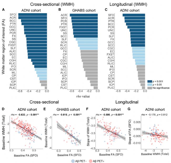 通過(guò)tau PET成像顯示,Braak I-VI區(qū)域的tau標(biāo)準(zhǔn)攝取比值(SUVR)與多個(gè)WM腦區(qū)的FA水平呈負(fù)相關(guān)(如海馬扣帶回CGH、穹窿FX等),且縱向數(shù)據(jù)表明tau聚集加速了FA下降。這一發(fā)現(xiàn)提示tau蛋白是微結(jié)構(gòu)WM退化的主要驅(qū)動(dòng)因子。Simoa技術(shù)的高靈敏度可直接檢測(cè)血液中的tau蛋白(如pTau-181、pTau-217),與PET數(shù)據(jù)形成互補(bǔ)。