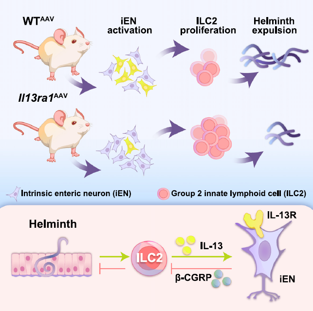 腸道作為人體 “免疫與神經(jīng)的交匯樞紐”,當(dāng)遭遇寄生蟲(如巴西日圓線蟲)入侵時(shí),2 型固有淋巴細(xì)胞(ILC2)會(huì)分泌 IL-13 等細(xì)胞因子啟動(dòng)抗寄生蟲防御;而腸內(nèi)固有神經(jīng)元(iENs)作為腸道 “本地神經(jīng)指揮中心”,是否參與這一過程長期未知。