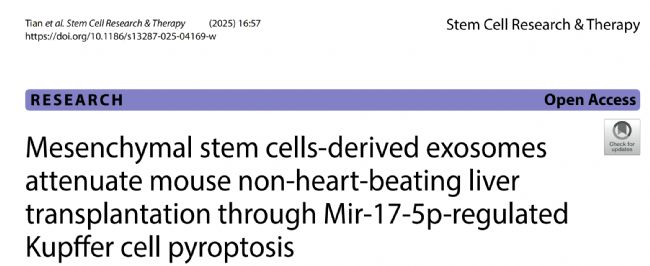 2025年1月,浙江大學(xué)醫(yī)學(xué)院附屬第二醫(yī)院研究團(tuán)隊(duì)在《Stem Cell Research & Therapy》(IF: 7.3)上發(fā)表題為《Mesenchymal stem cells-derived exosomes attenuate mouse non-heart-beating liver transplantation through Mir-17-5p-regulated Kupffer cell pyroptosis》的研究文章。該研究聚焦于心臟死亡供體(DCD)肝移植中缺血再灌注損傷(IRI)的關(guān)鍵機(jī)制,首次揭示間充質(zhì)干細(xì)胞外泌體(MSCs-Exo)通過miR-17-5p調(diào)控Kupffer細(xì)胞焦亡(pyroptosis),顯著改善移植肝存活率與功能,為緩解全球供肝短缺提供了新策略。
