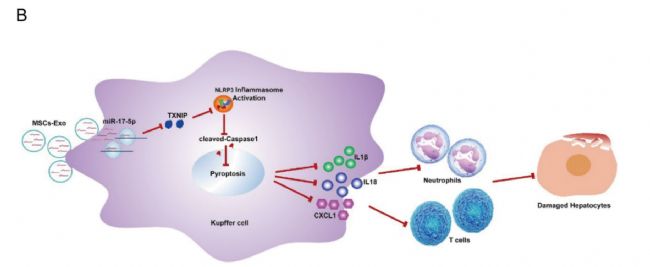 結(jié)果: 輸注MSCs-Exo減少了DCD肝移植物組織的損傷。體外和體內(nèi)實(shí)驗(yàn)表明,MSCs-Exo可以抑制過氧化氫誘導(dǎo)的庫普弗細(xì)胞焦亡。作者發(fā)現(xiàn)miR-17-5p在MSCs-Exo中顯著豐度,靶向和調(diào)控TXNIP表達(dá)。該作用通過經(jīng)典的Caspase1依賴性途徑抑制NLRP3介導(dǎo)的Kupffer細(xì)胞焦亡,減輕DCD肝移植物損傷。
