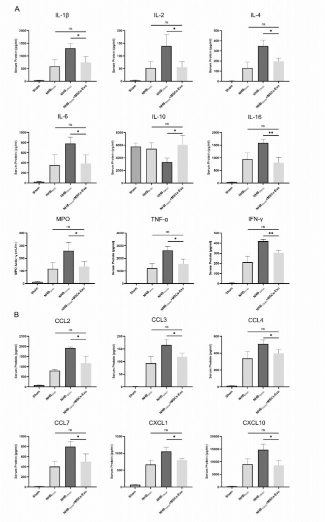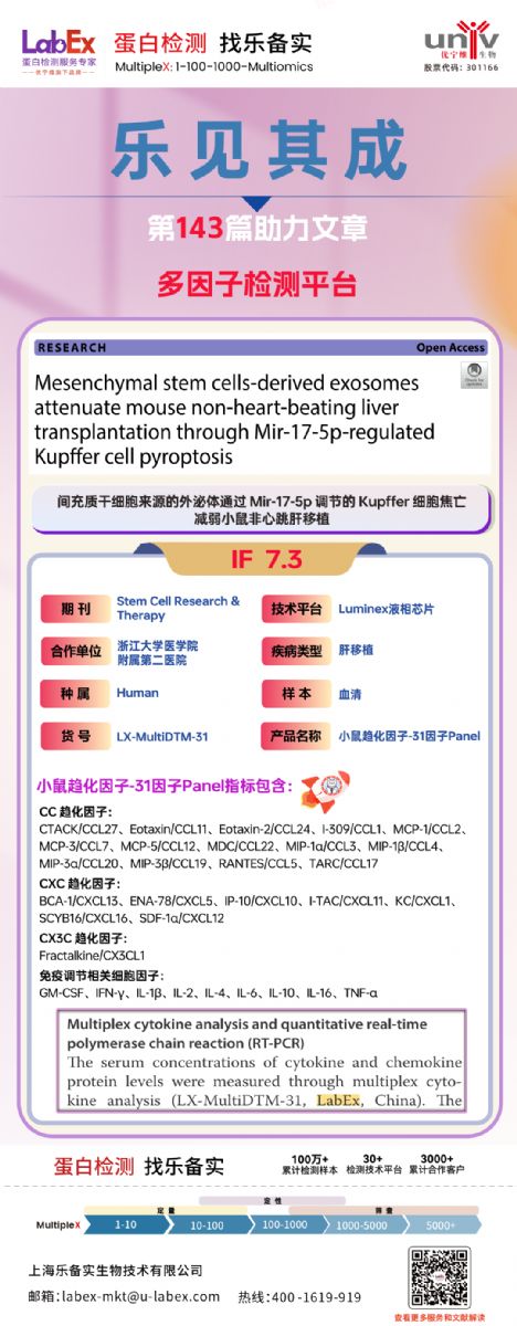 研究中,團(tuán)隊(duì)采用LabEx多因子液相芯片平臺(LX-MultiDTM-31),對移植后小鼠血清中31種炎癥因子與趨化因子進(jìn)行精準(zhǔn)定量。結(jié)果顯示,MSCs-Exo治療組顯著下調(diào)IL-1β、TNF-α、CXCL1等促炎因子,同時(shí)上調(diào)抗炎因子IL-10,證實(shí)其通過抑制Kupffer細(xì)胞焦亡-NLRP3炎癥小體通路阻斷級聯(lián)炎癥反應(yīng)。LabEx平臺的高靈敏度多靶點(diǎn)檢測能力,為闡明外泌體免疫調(diào)控機(jī)制提供了關(guān)鍵數(shù)據(jù)支持。