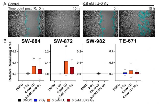 圖1 zenCELL owl記錄的劃痕遷移實驗,(A)對照組與LU+2 Gy聯合給藥組在0、10h的劃痕圖像(B)各細胞系剩余劃痕面積的統計、計算結果,其中:DMSO為對照組,各組均設計0.5 nM LU單藥、2 Gy單次放療、0.5 nM LU + 2 Gy(LU加入3h后照射)聯合給藥