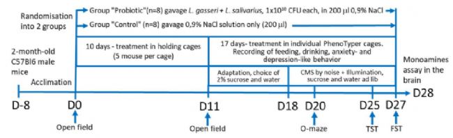 在整個實驗期間,使用2個月大的雄鼠。在小鼠適應后,隨機分配小鼠到治療組或對照組。治療組每天接受27天的益生菌混合物(LS + LG),通過使用小鼠灌胃套管進行胃內灌注。對照組則進行胃內灌注0.9% NaCl溶液。經過10天后,將小鼠單獨放入觀測籠中,觀測籠詳細情況見下文。在適應觀測籠1周后,小鼠接受CMS模型,該模型包括間歇性的聲音和光照。自動監測攝食行為,手動測量飲水量,食物、水和2%蔗糖溶液可隨意獲取。小鼠在不同的時間接受幾項行為測試,用于分析運動、焦慮和抑郁樣行為,包括曠場、高架十字迷宮、O型迷宮、懸尾試驗、強迫游泳實驗等測試,并使用EV等軟件來自動測量移動距離和花費時間等參數(實驗設計如圖1)。