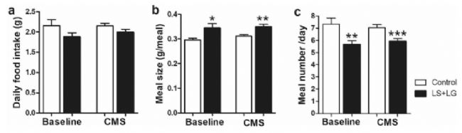 圖2. LS + LG對小鼠在CMS之前和期間的食物攝入量和進食模式的影響。每日食物攝入量 (a),進食量(b)和進食次數(c)