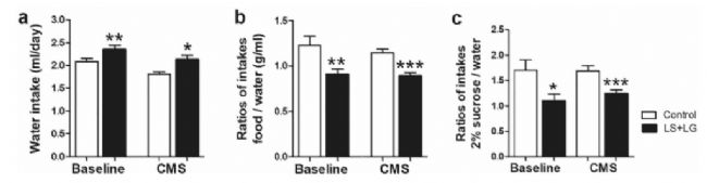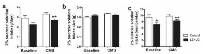 圖3.LS + LG對小鼠在CMS之前和期間攝入2%蔗糖及其模式的影響。每日蔗糖攝入量(a),每次攝入量的大小(b)和攝入次數(c)