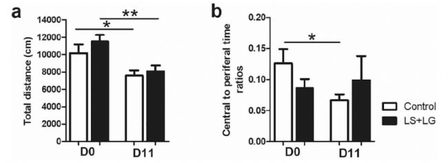 圖5.小鼠在LS + LG或作為對照的0.9% NaCl 溶液之前(D0)和之后10天(D11)的曠場試驗?傂凶呔嚯x(a)和中心到外圍時間比率 (b)