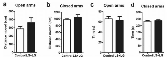 圖6.在接受LS + LG或 0.9% NaCl 溶液作為對照的小鼠中,CMS期間的O型迷宮測試。在O型迷宮的開放臂(a)和封閉臂(b)中移動的距離,以及在開放臂(c)和封閉臂(d)中花費的時間