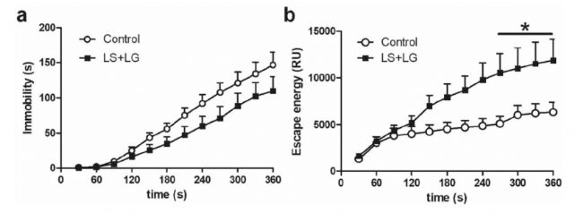 圖7.在接受LS + LG或0.9% NaCl溶液作為對照的小鼠中,CMS期間的懸尾試驗。TST中的不動時間(a)和逃逸能量(b)