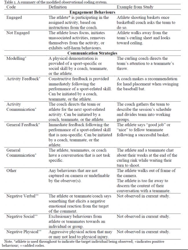 基于已有的教練-運動員觀察編碼系統修改而成,包括參與度和溝通策略兩大類共11個具體行為編碼(表1)。參與度類別由運動員在活動中的注意力和身體參與來定義,溝通策略類別由運動員、隊友和教練之間的語言和非語言溝通來定義的。