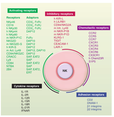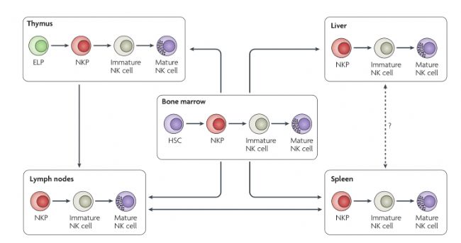 NK 細(xì)胞分布廣泛,主要存在于外周血、肝臟、脾臟、骨髓、肺、淋巴結(jié)等器官,在腸、皮膚、膀胱、扁桃體、子宮、胸腺、腎臟、胰腺、脂肪組織中也有發(fā)現(xiàn),部分研究在小鼠大腦中也檢測到其存在。
