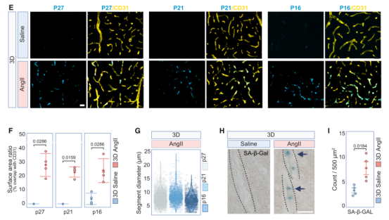 更具體來說,注射3天AngII后皮層毛細(xì)血管-微靜脈內(nèi)皮細(xì)胞(vCapEC)和毛細(xì)血管內(nèi)皮細(xì)胞(vEC)富集性表達(dá)能量穩(wěn)態(tài)信號基因下調(diào),氧化性脂肪酸代謝信號相關(guān)信號基因上調(diào),提示存在衰老表型。免疫熒光實驗發(fā)現(xiàn)周期蛋白依賴激酶抑制劑p21、p27在vCapEC中表達(dá)顯著增加,這種增加可被血管緊張素II 受體拮抗劑所阻斷,表明注射3天AngII后通過其受體引起皮層vCapEC衰老。
