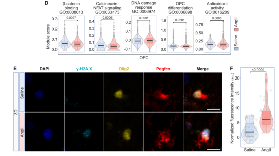注射3天AngII后皮層少突膠質(zhì)細(xì)胞前體細(xì)胞(OPCs)與DNA損傷相關(guān)的基因表達(dá)上調(diào),前體少突膠質(zhì)細(xì)胞的應(yīng)激反應(yīng)基因表達(dá)上調(diào),成熟少突膠質(zhì)細(xì)胞Neurexin-Neuroligin信號相關(guān)基因表達(dá)下調(diào)。免疫熒光實驗發(fā)現(xiàn)OPCs的DNA損傷標(biāo)志物γ-H2A.X表達(dá)上調(diào)。注射42天AngII后皮層OPCs與脂肪酸代謝相關(guān)的基因表達(dá)下調(diào)、DNA合成和細(xì)胞周期相關(guān)的基因表達(dá)也下調(diào),而骨形態(tài)發(fā)生蛋白信號相關(guān)基因表達(dá)上調(diào),表明OPCs的增殖、合成等過程出現(xiàn)紊亂。