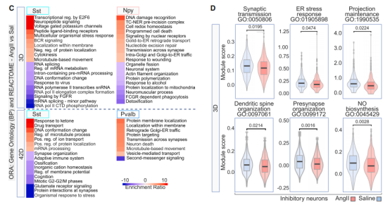 AngII注射誘導(dǎo)的神經(jīng)元轉(zhuǎn)錄組特征呈現(xiàn)出明顯的時間變化特征:中間神經(jīng)元差異性表達(dá)基因數(shù)量在注射后3天時達(dá)峰,第42天時減少,而該動態(tài)模式在興奮性神經(jīng)元中則未觀察到。