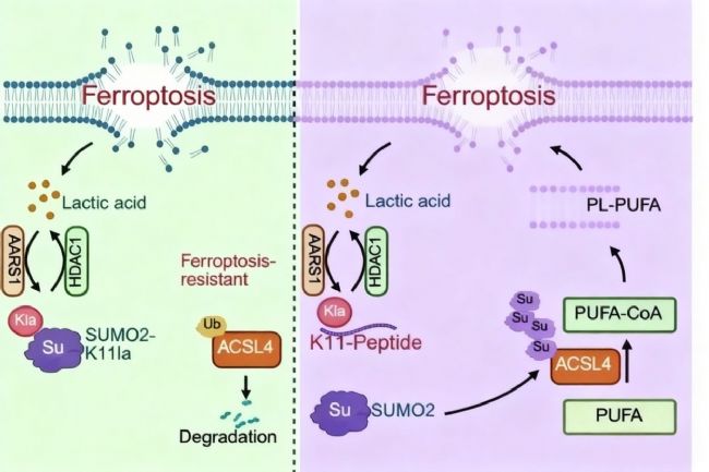 機制研究表明,SUMO2-K11乳酸化通過調控長鏈脂酰輔酶A合成酶4的穩定性影響鐵死亡敏感性。ACSL4是鐵死亡的關鍵執行者,負責催化多不飽和脂肪酸的酯化,促進脂質過氧化底物的生成。研究人員發現,SUMO2與ACSL4存在直接相互作用,且SUMO2-K11乳酸化可削弱這一相互作用。