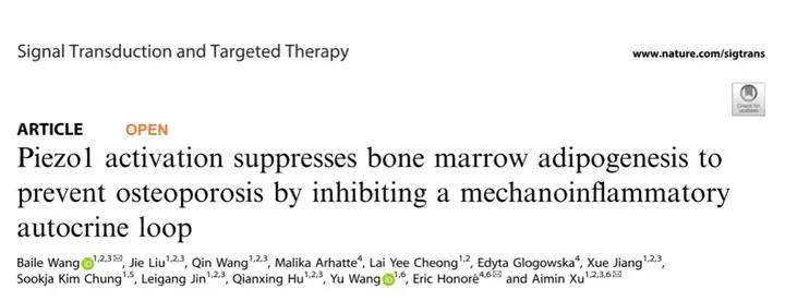 2025年10月28日,香港大學(xué)徐愛民、王柏樂教授聯(lián)合法國國家科學(xué)研究中心分子與細(xì)胞藥理學(xué)研究所Eric Honoré在國際知名期刊Signal Transduction and Targeted Therapy(IF=52.7)上發(fā)表了文章 “Piezo1 activation suppresses bone marrow adipogenesis to prevent osteoporosis by inhibiting a mechanoinflammatory autocrine loop”。研究發(fā)現(xiàn)BMMSCs中Piezo1的激活通過阻止CCL2-Lcn2炎癥自分泌環(huán)路來抑制骨髓脂肪生成以維持骨強(qiáng)度,從而揭示了之前未知的機(jī)械轉(zhuǎn)導(dǎo)、炎癥和細(xì)胞命運(yùn)決定之間的聯(lián)系。