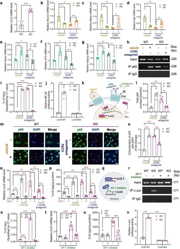 大量證據(jù)表明,骨髓間充質(zhì)干細(xì)胞來源的自分泌因子在決定骨髓間充質(zhì)干細(xì)胞的譜系定向方面具有重要意義。研究人員進(jìn)一步探究了Piezo1下游調(diào)控BMMSCs成骨或成脂作用的分泌因子,篩選發(fā)現(xiàn)了在Piezo1缺失的BMMSCs中顯著增加的促炎細(xì)胞因子lipocalin-2 (Lcn2)和Ccl2。接下來研究人員探討了Piezo1缺失是如何上調(diào)BMMSCs中Lcn2的表達(dá)和分泌。qPCR分析和Olink數(shù)據(jù)顯示,Piezo1 KO BMMSC中Ccl2的表達(dá)和分泌水平均大幅升高。Ccl2已被證明通過其自分泌作用在腫瘤細(xì)胞中誘導(dǎo) Lcn2,為了研究 Lcn2 水平是否通過 Ccl2 的 Piezo1 依賴性自分泌作用進(jìn)行調(diào)節(jié),研究人員首先確認(rèn)了 BMMSC 中 Ccl2 受體 CCR2 的表達(dá),并發(fā)現(xiàn)它在 Piezo1 KO BMMSC 中顯著上調(diào),此外重組小鼠CCL2蛋白能地將BMMSCs的分化潛能從成骨轉(zhuǎn)變?yōu)槌芍,并增加了WT BMMSCs中Lcn2的表達(dá)和分泌,而CCR2拮抗劑INCB3344可逆轉(zhuǎn)Piezo1 KO BMMSCs 的上述表型,表明CCL2-CCR2信號促進(jìn)成脂抑骨。進(jìn)一步研究表明Piezo1 通過抑制 Ccl2 誘發(fā)的 NF-κB 激活來抑制 Lcn2 表達(dá)和分泌。