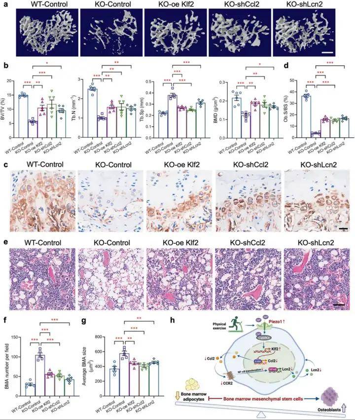 為了驗(yàn)證KLF2-CCL2-Lcn2軸作為Piezo1的下游信號效應(yīng)器,參與調(diào)控骨髓間充質(zhì)干細(xì)胞命運(yùn),研究人員利用慢病毒在小鼠體內(nèi)過表達(dá)KLF2或下調(diào)CCL2/Lcn2,并在體外BMMSCs已證實(shí)該策略的有效性,以及慢病毒脛骨內(nèi)注射的特異性轉(zhuǎn)導(dǎo)。在PDGFRα+BMMSCs中恢復(fù)KLF2的表達(dá)逆轉(zhuǎn)了Piezo1 KO小鼠的骨體積減少、骨小梁數(shù)量減少、骨密度降低、ALP染色的成骨細(xì)胞減少、骨小梁分離增加和BMA增加。同樣,在Piezo1缺陷的PDGFRα+BMMSCs中,CCL2或Lcn2被敲低到與WT BMMSCs相當(dāng)?shù)乃剑軠p輕Piezo1 KO小鼠的骨丟失和骨髓肥胖癥。此外,CCL2基因敲低降低了Lcn2的表達(dá)和分泌,而KLF2過表達(dá)抑制了KO BMMSCs中CCL2和Lcn2的表達(dá)和分泌,進(jìn)一步支持了KLF2-CCL2-Lcn2信號軸介導(dǎo)Piezo1缺乏引起的小鼠骨丟失和骨髓肥胖的觀點(diǎn)。