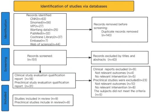 初步檢索8個數(shù)據(jù)庫共獲得291項研究,經(jīng)篩選最終納入9項高質(zhì)量臨床研究和8項臨床前研究(研究篩選流程見圖1的PRISMA流程圖)。臨床研究共涉及788例患者,平均年齡22-47歲,治療時長12-24周;臨床前研究共使用159只雄性大鼠,干預方式為電刺激或電針刺激,干預部位為耳部,干預時長30分鐘至12小時。