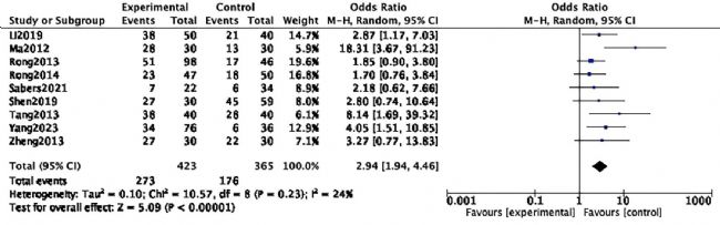 應答率:固定效應模型的合并比值比分析顯示,taVNS干預的應答率顯著高于對照組(圖2)。