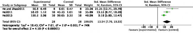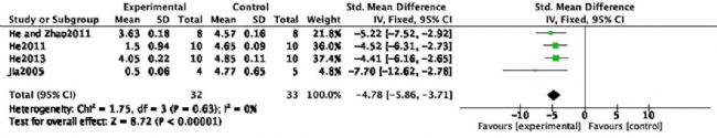 發(fā)作頻率:4 項研究用固定效應模型分析,taVNS 組癲癇動物的發(fā)作頻率顯著低于對照組(圖6)。