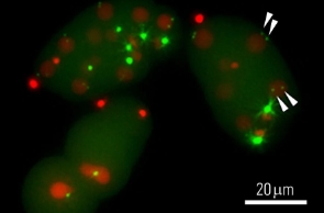 Cells from C. elegans expressing the fluorescent proteins SPD5-GFP indicating a centriole marker (green) and Histon 2B-Cherry indicating nuclei (red). The 2 pairs of centrioles in the interphase cells are marked with white arrows. The image is the maximum projection of a Z-stack after ICC (instant Computational Clearing) and SVCC (small volume Computational Clearing).