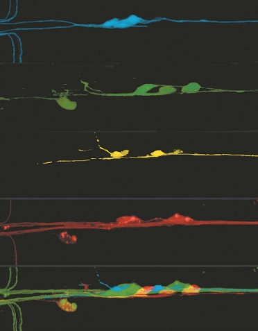 Studying the nervous system of C. elegans: Leica confocal microscope images of a roundworm expressing the fluorescent proteins CFP (cyan), GFP (green), YFP (yellow), and DsRed (red).