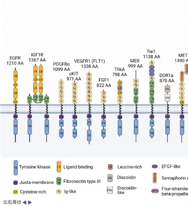 - 細胞外結構域:具備配體 (生長因子) 結合位點,負責識別并結合特定配體。此部分包含多種具有特定氨基酸序列的結構域,例如富半胱氨酸結構域、酸性結構域、免疫球蛋白樣結構域等。