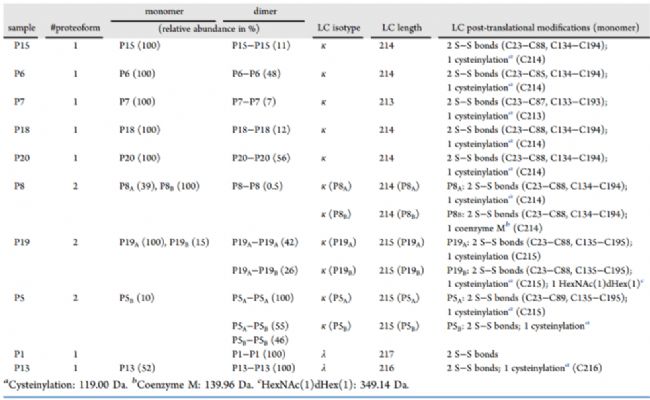 top down方法的結(jié)合,以及使用適當(dāng)?shù)纳虡I(yè)軟件工具,首次在序列、PTMs和單體或二聚體形式的存在方面表征LCs的高可變性,能夠識(shí)別出與特定患者的特定治療方法相關(guān)的意外修飾,同一患者出現(xiàn)不同的LC序列表明存在多個(gè)漿細(xì)胞克隆或指向不可預(yù)測(cè)的成熟過(guò)程。該研究的總體目標(biāo)是確定影響這些LC聚集傾向并導(dǎo)致疾病的主要因素,以了解聚合過(guò)程并能夠在將來(lái)防止聚集的發(fā)生。
