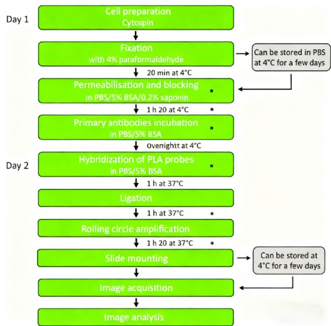 其核心技術(shù)原理在于:針對目標(biāo)蛋白的特異性一抗分別與帶有互補序列的DNA探針的二抗結(jié)合。當(dāng)兩個目標(biāo)蛋白在細(xì)胞內(nèi)空間距離接近(<40 nm)時,其連接的DNA探針隨之靠近,在連接酶作用下環(huán)化成完整的環(huán)形DNA模板。隨后通過滾環(huán)擴增(RCA)產(chǎn)生大量單鏈DNA重復(fù)序列,并使用熒光標(biāo)記的寡核苷酸探針進(jìn)行檢測。最終,熒光顯微鏡下的每個熒光信號點即代表一處蛋白質(zhì)相互作用的位點,實現(xiàn)“所見即所得”的直觀分析。