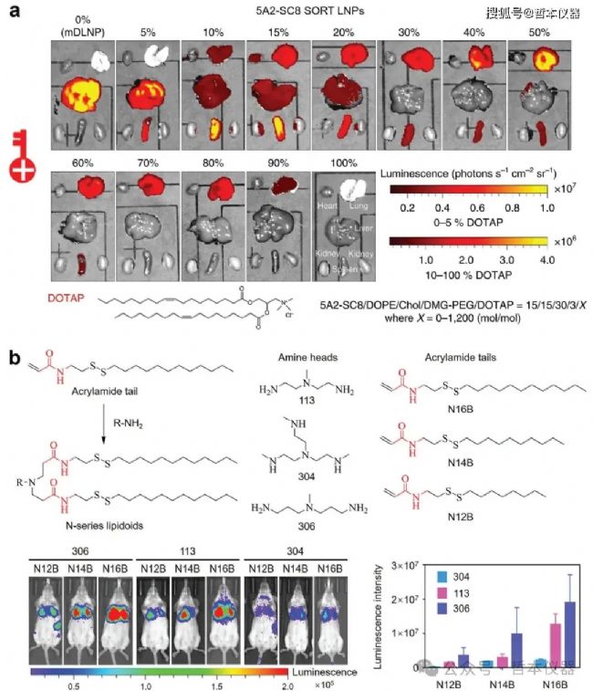 近期,選擇性器官靶向 SORT-LNP 通過在四組分配方中添加陽離子脂質(zhì)(如DOTAP、DDAB或EPC)實(shí)現(xiàn)了肺部靶向(圖1a)。這種LNP能夠轉(zhuǎn)染約40%的上皮細(xì)胞、65%的內(nèi)皮細(xì)胞和20%的免疫細(xì)胞。專門針對(duì)肺部的SORT-LNP,如50% DOTAP組成的LNP,能誘導(dǎo)PTEN編輯;而9A1P9-DDAB iPLNP則轉(zhuǎn)染34%的內(nèi)皮細(xì)胞、20%的上皮細(xì)胞和13%的免疫細(xì)胞,并顯示高mRNA表達(dá)。通過用陽離子替代物代替輔助脂質(zhì),可以將藥物靶向從肝臟轉(zhuǎn)移至肺部。例如,將DOTAP替代DOPE后,肝臟與肺部的蛋白質(zhì)表達(dá)比從36:1變?yōu)?:56。