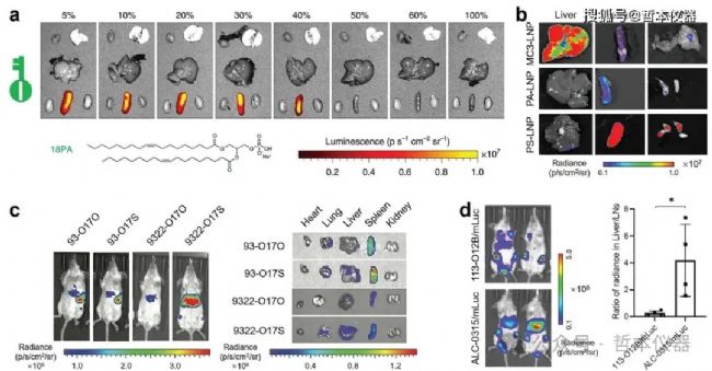 對(duì)比9A1P9和10A1P16制劑,后者顯示出更佳的遞送效率,能夠轉(zhuǎn)染約30%的巨噬細(xì)胞和6%的B細(xì)胞。用磷脂酰絲氨酸(PS)替代DOPE,可以將肝臟靶向轉(zhuǎn)移至脾臟,蛋白表達(dá)比例由8:1變?yōu)?:3。此外,將PS添加到基于MC3的Onpattro LNP中,可使其靶向淋巴結(jié)和脾臟(圖2b)。