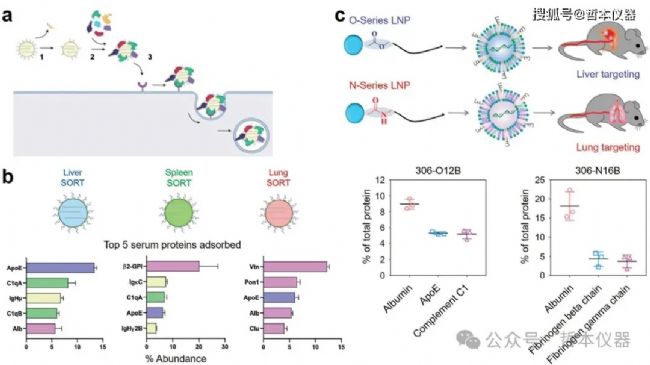 此外,脂質(zhì)賦形劑的化學(xué)性質(zhì)也會(huì)影響生物分子冠。例如,酰胺連接體替代可電離脂質(zhì)中的酯連接體可改變靶器官,從肝臟轉(zhuǎn)移到肺部。盡管在LNP上,白蛋白往往是主要成分,但其他成分如ApoE和纖維蛋白原的豐度可能因LNP的類型而異(圖6c)。改變SORT脂質(zhì)的化學(xué)結(jié)構(gòu)可能會(huì)稍微改變每種成分的比例,從而影響LNP的靶向能力。