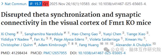 2025年11月25日,普渡大學(xué)(Purdue University)黃方(Fang Huang)團隊在nature communications發(fā)表了一篇名為“Disrupted theta synchronization and synaptic connectivity in the visual cortex of Fmr1 KO mice”的文章,其內(nèi)容指出脆性 X 綜合征(FX)是導(dǎo)致自閉癥譜系障礙的主要遺傳性疾病,患者存在感覺超敏和視覺學(xué)習(xí)受損等癥狀。此前研究已發(fā)現(xiàn)野生型(WT)小鼠視覺經(jīng)驗可誘導(dǎo)初級視覺皮層(V1)和外側(cè)內(nèi)側(cè)區(qū)(LM)同步 θ 振蕩以支持區(qū)域間感覺整合,而 Fmr1 基因敲除(KO)的 FX 小鼠存在 V1 區(qū)視覺熟悉性誘發(fā) θ 振蕩減弱的問題,但關(guān)于 FX 小鼠 V1 與 LM 之間的區(qū)域間同步性、突觸連接可塑性及樹突棘重塑的機制尚不明確。