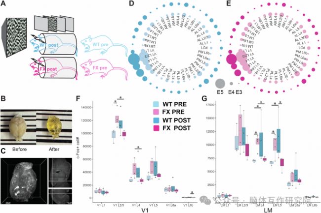 對 WT 和 FX 小鼠進行視覺熟悉性訓(xùn)練,訓(xùn)練前后取腦進行 iDISCO 全腦透明化處理,通過 c-Fos 免疫熒光標記結(jié)合光片顯微鏡成像,量化 V1 和 LM 區(qū)神經(jīng)元活動水平。