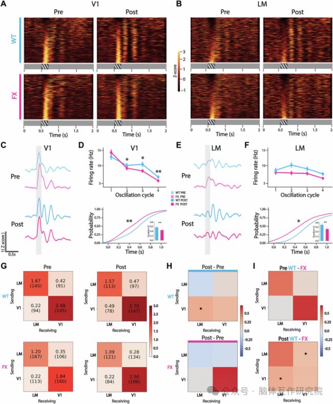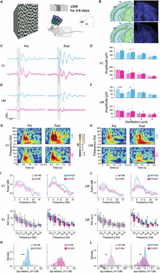 局部場電位層面:視覺經(jīng)驗后,WT 小鼠 V1 和 LM 區(qū)出現(xiàn)強且持久的刺激鎖定 θ 振蕩,振蕩功率顯著升高,且 V1 與 LM 區(qū) θ 振蕩相位差向 0 偏移、分布變窄,表明區(qū)域間同步性增強;而 FX 小鼠 V1 和 LM 區(qū) θ 振蕩功率增幅不足,區(qū)域間相位同步性無顯著變化,振蕩持續(xù)時間縮短。