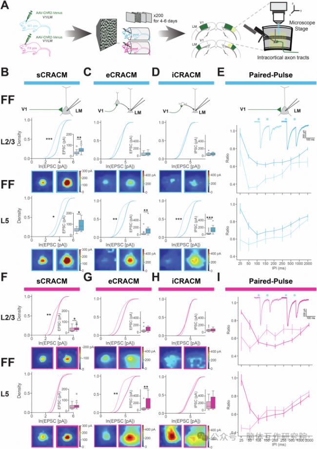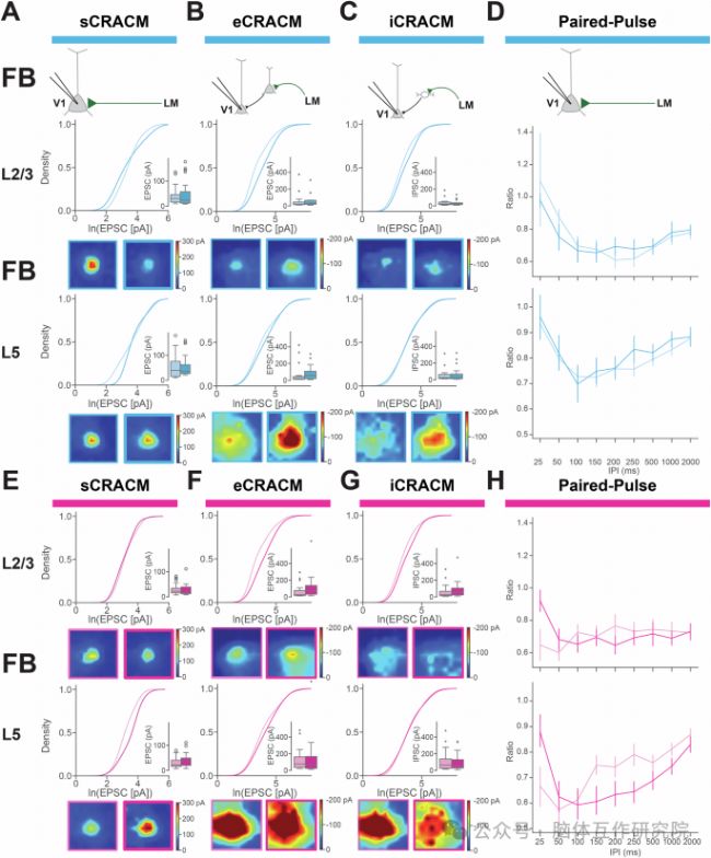 向 V1 或 LM 區(qū)注射 AAV1-ChR2-Venus 病毒,3 周后進行視覺訓(xùn)練,取急性腦片開展亞細胞通道視紫紅質(zhì)輔助環(huán)路映射記錄,結(jié)合 TTX 和 4-AP 阻斷動作電位,量化 V1→LM 前饋和 LM→V1 反饋通路的突觸強度;同時通過配對脈沖刺激評估突觸前短時程可塑性。