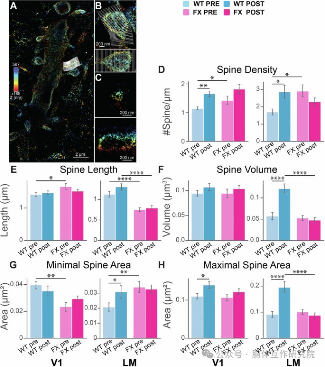 基線狀態(tài):FX 小鼠 V1 和 LM 區(qū)樹突棘密度顯著高于 WT 小鼠,V1 區(qū)棘突長度更長、棘頸最小面積更小,提示 FX 小鼠存在樹突棘結(jié)構(gòu)發(fā)育異常。