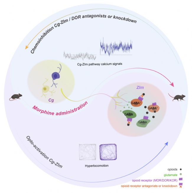 抑制Cg-ZIm環路可明顯減少急性及慢性嗎啡誘導的過度活動,同時不改變嗎啡的鎮痛效果;而光遺傳激活Cg-ZIm即可“模擬”嗎啡注射后引起的運動亢進效應。這些數據提供了直接證據:該興奮性環路是嗎啡導致小鼠過度運動的關鍵驅動力。