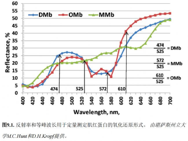 在等波長點(即三種肌紅蛋白形式中兩種或以上具有相同反射率的波長,參見圖9.1)處測量的肉樣表面反射率,需轉換為 K/S 值(計算方法詳見C節,Judd和Wyszecki,1963)。將反射率轉換為 K/S 值能提升數據線性度,同時有助于校正肉品的散射特性(S =散射系數)和吸收特性(K =吸光系數)(Francis和Clydesdale,1975)。樣本的 K/S 值需代入方程計算,這要求必須預先確定三種主要肉品色素形式100%的參考值。需注意的是,每種100%肌紅蛋白形式的 K/S 參考值會因實驗條件、包裝方式、樣本特性及儀器差異而有所不同。因此,研究人員應通過實驗樣本自行測定100%參考值,而非直接采用已發表的數值。