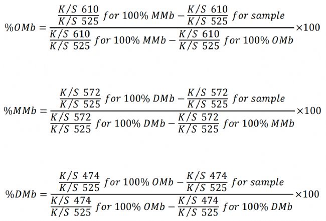 估算DMb、OMb和MMb(以及相應的血紅蛋白形式)對肉類色素穩定性的基礎研究至關重要。不過,Ledward(1970)指出,通過反射率估算的色素化學形態準確度僅±6%或7%。 AMSA 網站上可獲取DMb、OMb、COMb和MMb的數碼照片。