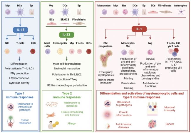IL-1家族成員通過調(diào)控髓系細(xì)胞功能、訓(xùn)練性先天免疫、淋巴細(xì)胞極化等過程,在先天免疫與適應(yīng)性免疫的協(xié)同作用中扮演關(guān)鍵角色。