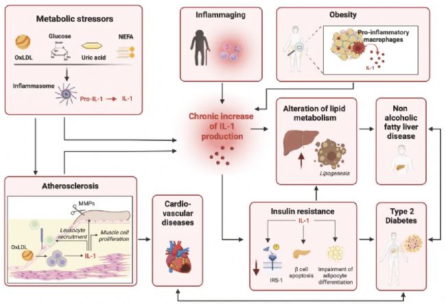 IL-1β是代謝紊亂與心血管疾病的關(guān)鍵紐帶。肥胖、高血糖等代謝應(yīng)激可激活炎性小體,導(dǎo)致IL-1β持續(xù)升高,通過抑制胰島素受體底物1(IRS-1)磷酸化引發(fā)胰島素抵抗,促進(jìn)2型糖尿病發(fā)生。同時(shí),IL-1β可促進(jìn)肝細(xì)胞脂質(zhì)新生,加速非酒精性脂肪肝病(NAFLD)進(jìn)展;在動(dòng)脈粥樣硬化中,IL-1α、IL-1β和IL-18通過促進(jìn)內(nèi)皮細(xì)胞活化、平滑肌細(xì)胞增殖及斑塊不穩(wěn)定,加劇血管損傷。 IL-18在代謝平衡中具有雙重作用,其缺乏會(huì)導(dǎo)致食欲調(diào)節(jié)異常和肥胖,但過度激活則會(huì)促進(jìn)動(dòng)脈粥樣硬化。IL-33和IL-37則展現(xiàn)出保護(hù)作用,IL-33可通過激活I(lǐng)LC2細(xì)胞增強(qiáng)胰島素分泌,IL-37則減輕脂肪組織炎癥,改善胰島素抵抗。