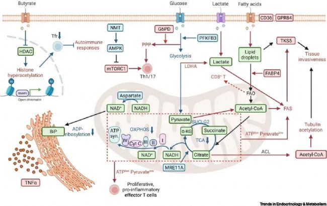 T細胞的代謝表型與功能狀態高度關聯,形成"代謝-功能"的雙向調控網絡。糖代謝活躍的T細胞通常傾向于分化為增殖能力強、炎癥因子分泌旺盛的效應T細胞(如CD8+細胞毒性T細胞、Th1/Th17細胞),其有氧糖酵解產生的乳酸等代謝產物還可通過調節腫瘤微環境等方式,增強免疫殺傷效率;而依賴脂肪酸氧化(FAO)的T細胞則更易形成記憶T細胞,通過維持線粒體穩態和代謝可塑性,實現長期免疫記憶功能。 代謝重編程的異常調控還與疾病發生密切相關。若糖代謝過度激活可能導致T細胞功能亢進,引發自身免疫性疾病;而腫瘤微環境中T細胞的代謝受限(如葡萄糖匱乏、乳酸堆積)則會導致其功能耗竭,削弱抗腫瘤免疫應答。因此,靶向T細胞代謝重編程關鍵分子(如PFKFB3、LDHA、FAS等)調節代謝途徑,已成為免疫相關疾病治療的潛在方向。