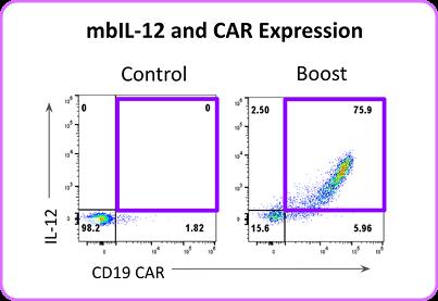 圖3. 在T細胞導入(boost)48小時后,通過流式細胞術檢測CD19 CAR與mblL-12的表達情況。