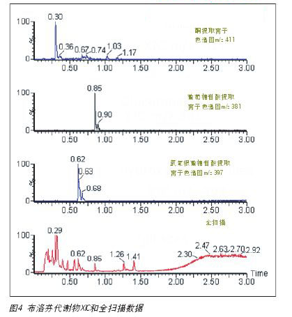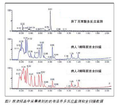 尿液是從服用400毫克布洛芬八個小時之后志愿者上采集的。樣品進樣分析之前冷凍保存。樣品的制備是樣品以13000RCF的速度離心5分鐘,然后用水進行稀釋,再把樣品注入UPLC/MS/MS系統(tǒng)中。